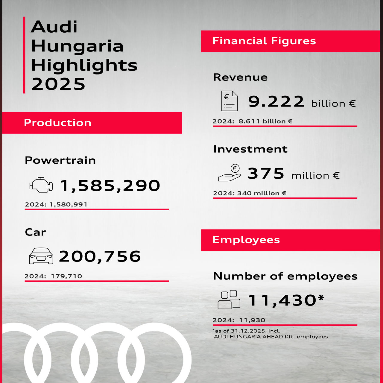 Győr, 17. März 2026 – Trotz eines schwierigen Marktumfeldes erzielte Audi Hungaria im Jahr 2025 eine gute Performance mit soliden Produktionsvolumen und finanziellen Erge...